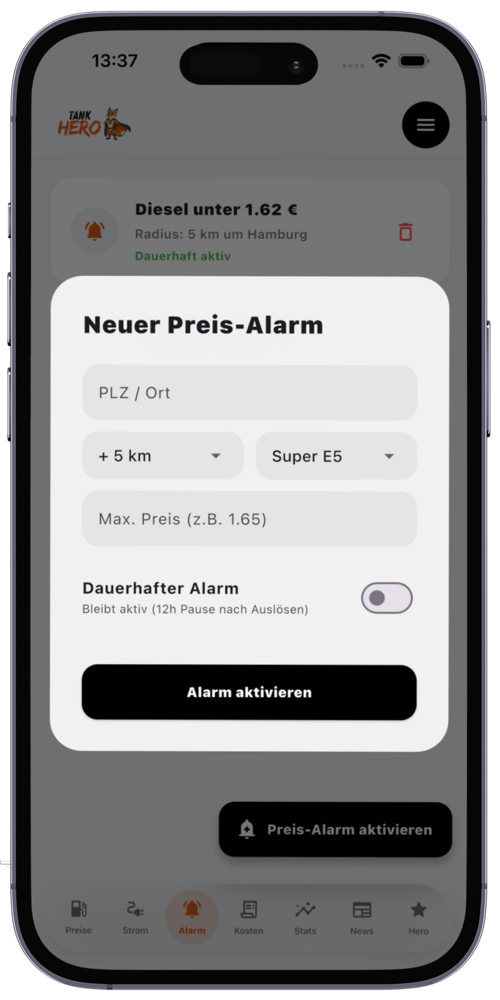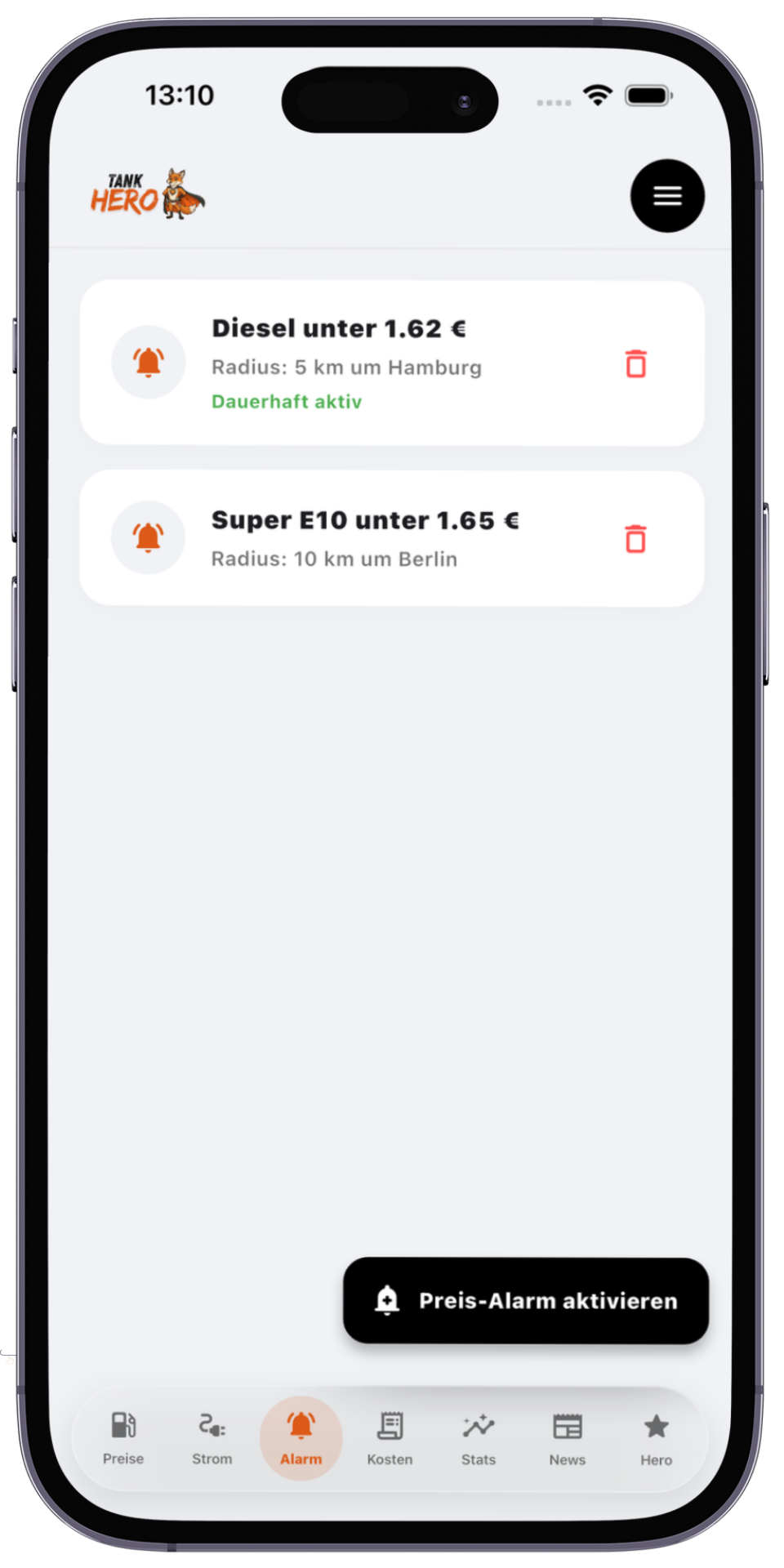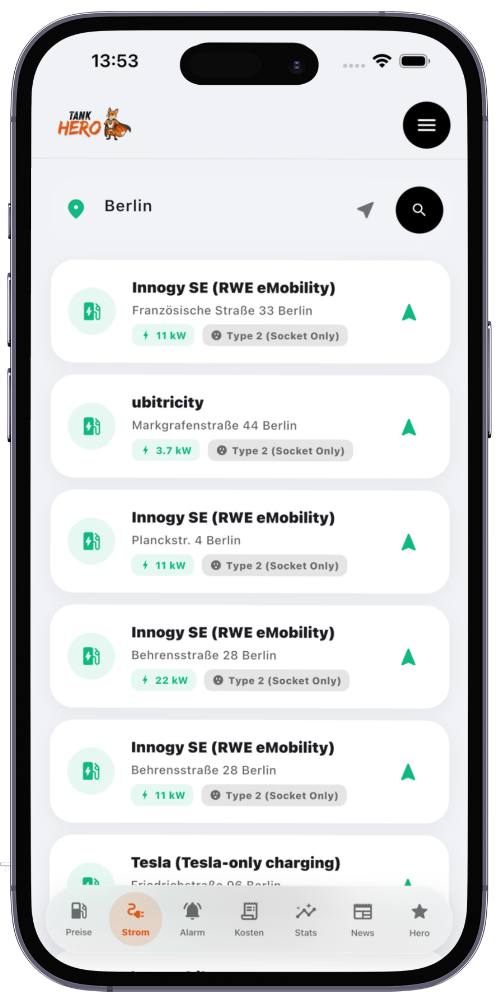 Vergleiche Preise in Echtzeit oder finde die nächste freie Ladesäule. Lade dir die kostenlose App für smarte Alarme und deine Kosten-Statistiken herunter.