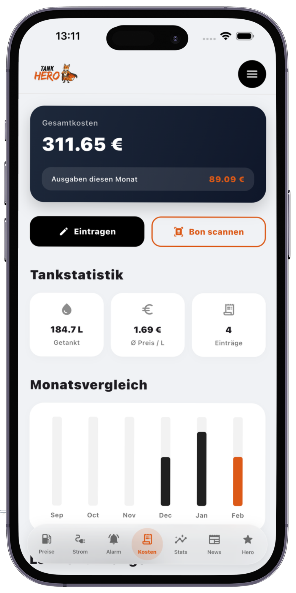 Lerne aus deinem Tankverhalten. Mit unseren Monatsauswertungen siehst du genau, wohin dein Geld fließt (inklusive präzisem Steuer-Split).